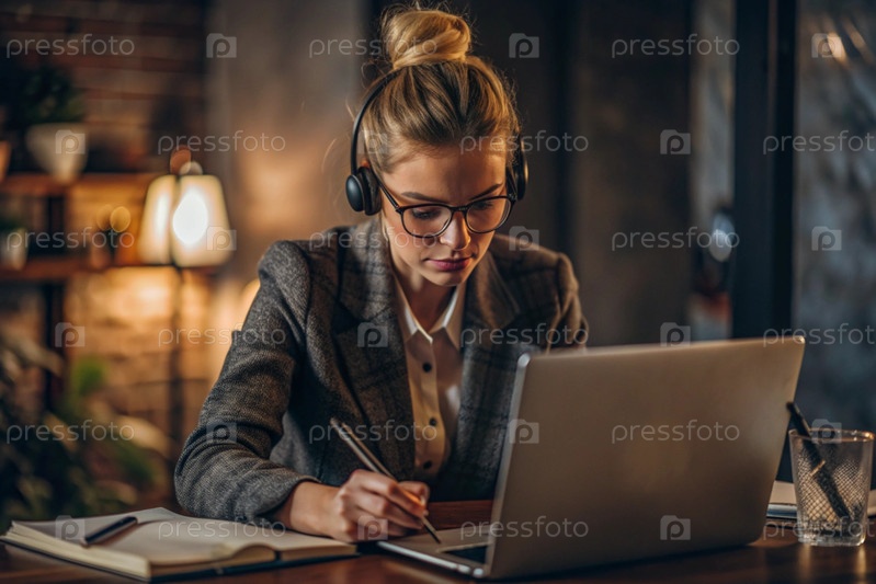 Молодая женщина фрилансер в очках и наушниках работает на ноутбуке или делает покупки в интернет-магазине