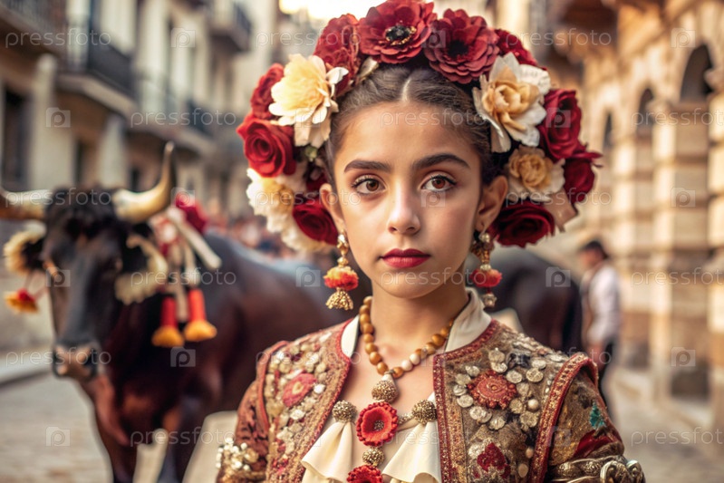 Испанская девушка в традиционном испанском национальном костюме. Перед быком. Бикоборство. Портрет символизирует традиции и культуру народа Испании