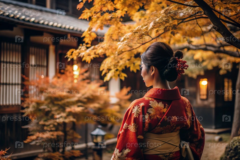 Японская девушка в традиционном национальном костюме - кимоно. На сказочном фоне фонарики и осенние деревья. Портрет символизирует традиции и культуру народа Японии