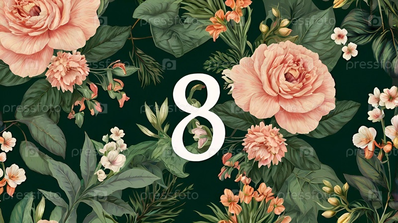 Международный женский день. праздник приходится на 8 марта. баннер, флаер. праздничный цветочный фон с номером 8