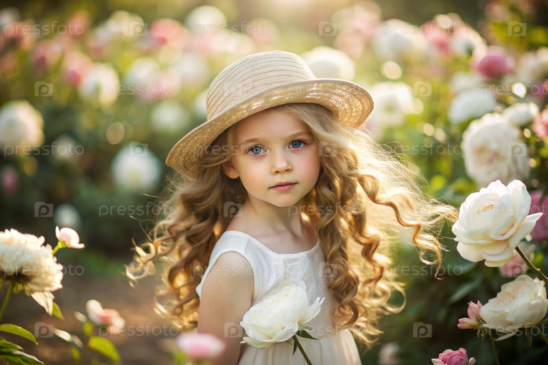 Портрет красивой маленькой кудрявой 4-летней девочки в соломенной шляпе и платье в цветущем саду пиоников. Детство. Ребенок позирует и смотрит на камеру