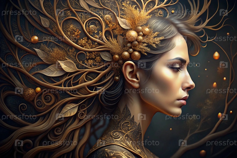 Творческий баннер для салона красоты в черно-золотом цвете. Красивая женщина, окруженная лесом с макияжем и волосами. Золотые ветви дерева в волосах. Индустрия красоты