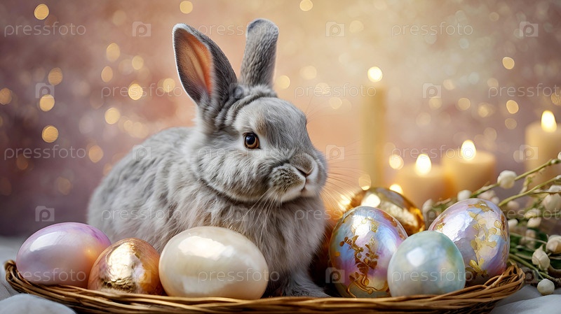 Нежные пасхальные жемчужинные яйца в корзине, кролик и нежные цветы на пастельном аквареле