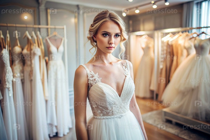 Аренда и покупка свадебных платьев для мероприятий. близко. красивая девушка Невесна пробует на себе элегантное белое свадебное платье в роскошном брачном салоне
