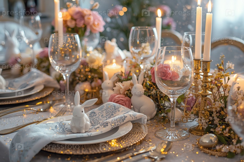 Пасхальный баннер 2026. декоративная тарелка, столовая посуда, стаканы, пасхальные яйца и кролики. концепция празднования Пасхи для кафе и ресторанов