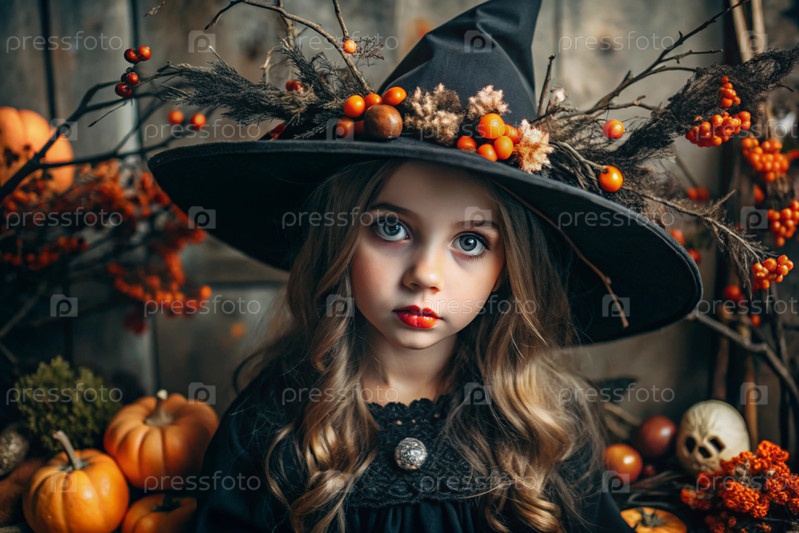 Осенний портрет красивой девушки в костюме ведьмы с осенними ягодами, тыквами и черными птицами. баннер, открытка. концепция Хэллоуина