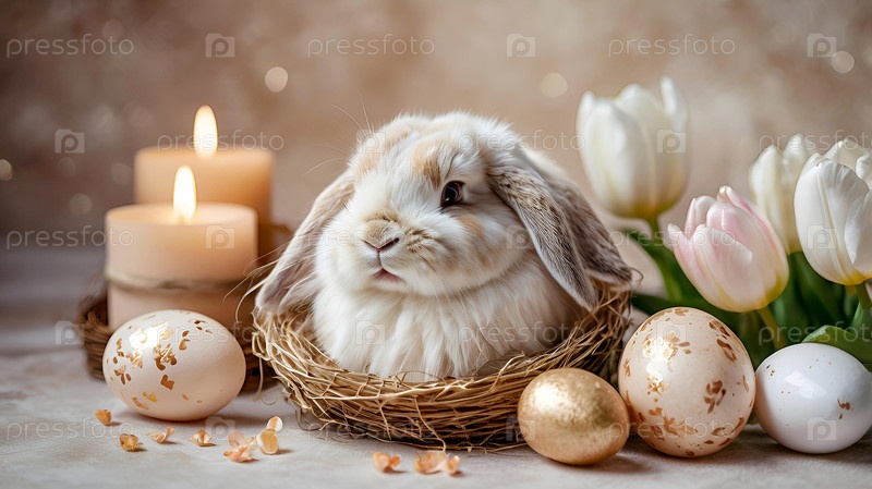 Нежные пасхальные жемчужинные яйца в корзине, кролик и нежные цветы на пастельном аквареле