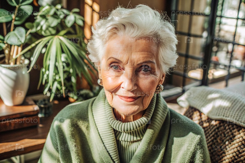 Минимализм.Студийный портрет стильной, элегантной пожилой женщины, 70-летнего пенсионера в интерьере и одежде спокойных тонов.Концепция пожилых людей