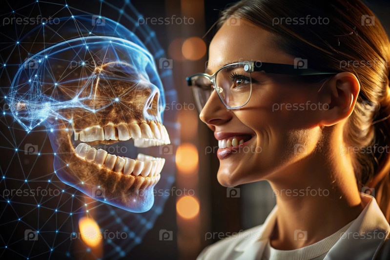 Новые технологии цифрового искусственного интеллекта в зубных протезах. Имплантаты. Женщина-стоматолог с идеальной улыбкой и цифровой графикой на виртуальном экране