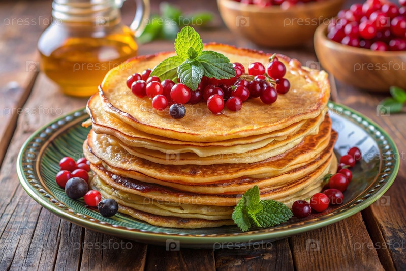 Вкусные блины с медом, ягодами, чернилами, клюквами и малиной.Концепция российского праздника Масленица