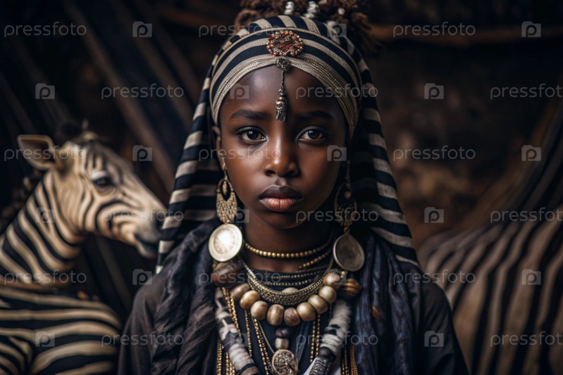 Красивая африканская девушка в традиционном национальном костюме против зебры портрет символизирует традиции и красоту африканского народа