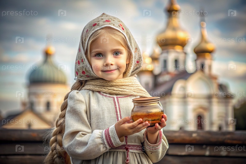 Концепция российского православного праздника 'Мед Спаситель' - красивая маленькая девочка в русской национальной одежде и шарф с баночкой меда на фоне православной церкви