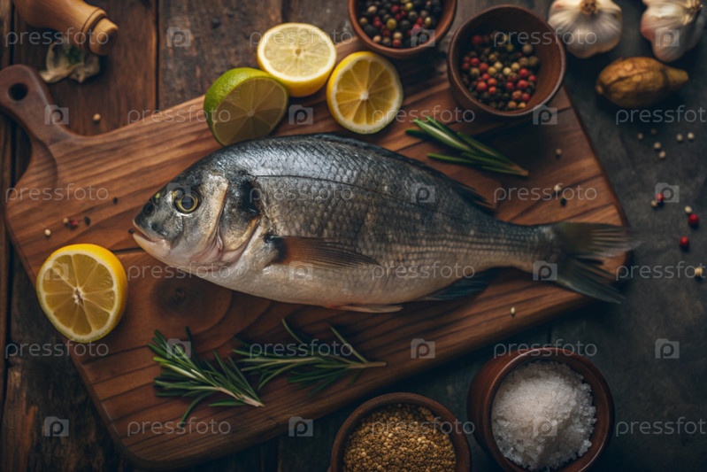 Вкусная и здоровая рыба. сырой дорадо с лимоном и ингредиентами на темном фоне. баннер, меню, место для текста рецепта, верхний вид