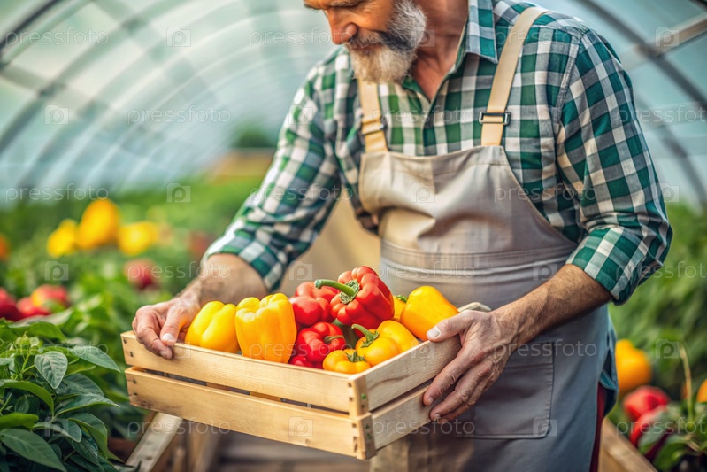 Сельскохозяйственная промышленность. деревянный ящик с перцем в руках фермера. садовник собирает богатый урожай в теплице