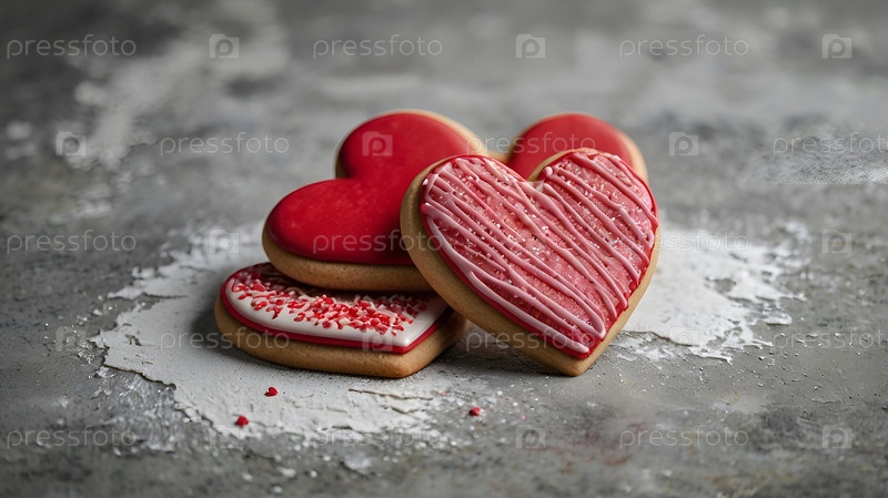 Домашние имбирные печенье в форме сердца с красным сахаром вкусное сердце бисквита из имбиря на сером бетонном фоне свежевыпеченный пряник для дня святого Валентина