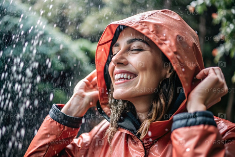 Счастливая молодая женщина в плаще наслаждается дождем на фоне зеленого леса, концепцией наслаждения естественной спокойной жизнью, окружающей средой, образом жизни