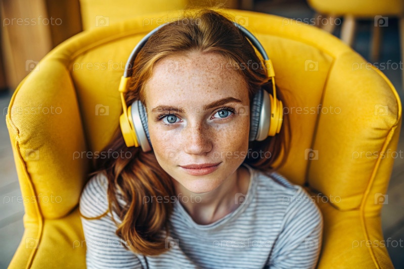Молодая красивая рыжеволосая женщина с веснушками слушает музыку в больших беспроводных наушниках дома на стуле в гостиной