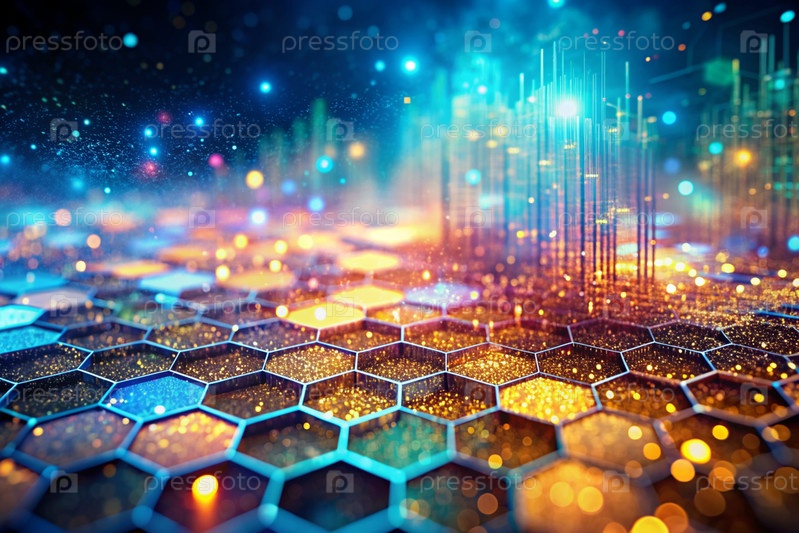 Высокотехнологичный материал. Близкий план клеточного рисунка с многоцветными огнями, создавая абстрактный и футуристический дизайн. Концепция развития и технологии будущего