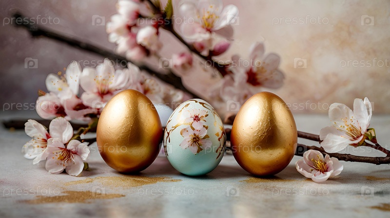 Нежные пасхальные яйца и вишневые ветви цветут на пастельном акварельном фоне с нежными полосками