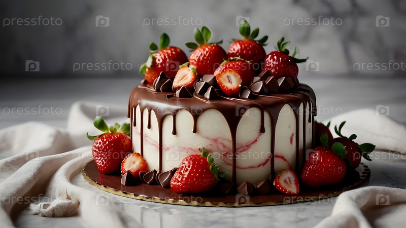 Концепция праздничных блюд. Пекарня. Красивый вкусный торт со свежими клубниками и шоколадом на столе. День рождения и сладости