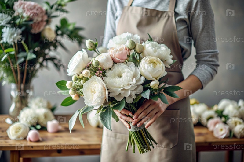 Малый бизнес. Декоратор цветочной лавки держит для покупателя красивый деликатный букет пионьев. Цветочный дизайн. Доставка цветов, обработка заказов