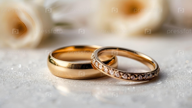 Золотые обручальные кольца на белом фоне со стороной