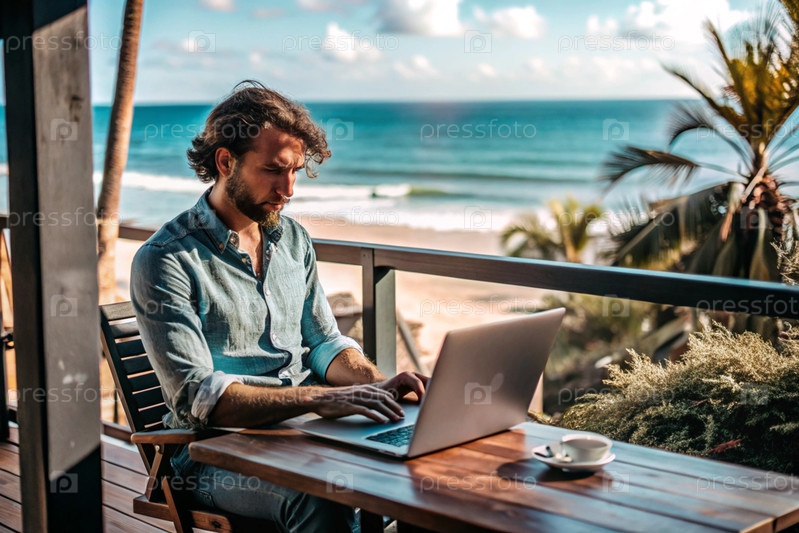 Молодой бизнесмен-фрилансер работает на ноутбуке, отдыхая у моря или делая покупки в Интернете