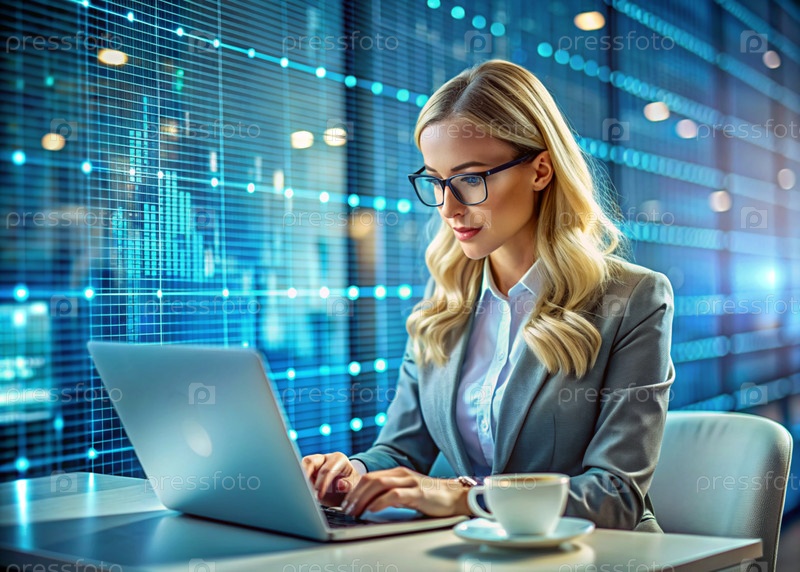Красивая молодая женщина в костюме работает на ноутбуке в офисе с цифровыми кодами на виртуальном экране Цифровые технологии будущего Разработка программного обеспечения