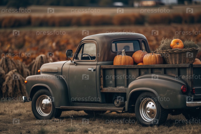 Осень, осенний дизайн.Большой урожай тыквы на заднем сиденье ретро-пикапа, крупный план