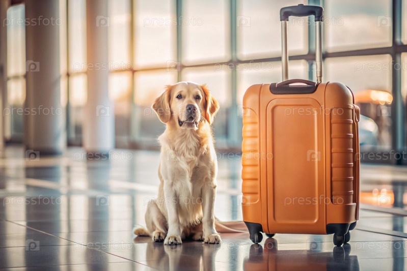 Чемодан в пустом аэропортовом салоне и собака, сумки для путешествий в терминале вылета, концепция летнего отдыха с домашними животными, пространство для текста или дизайна