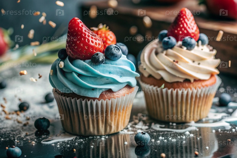 Вкусные красочные кексы со земляницами и чернилами. праздничный кекс, который идеально подходит для веселых торжеств. счастливого дня рождения