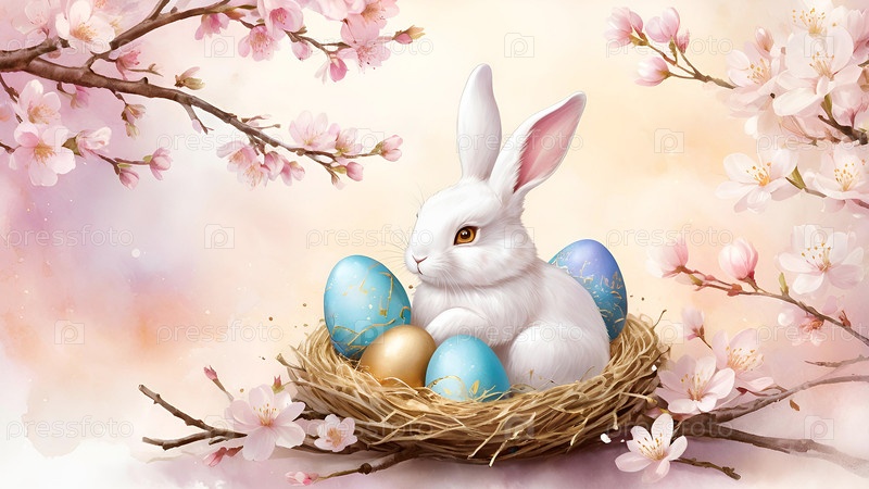 Нежные пасхальные яйца, белый кролик и вишневые ветви на фоне пастельного акварели с нежными полосками