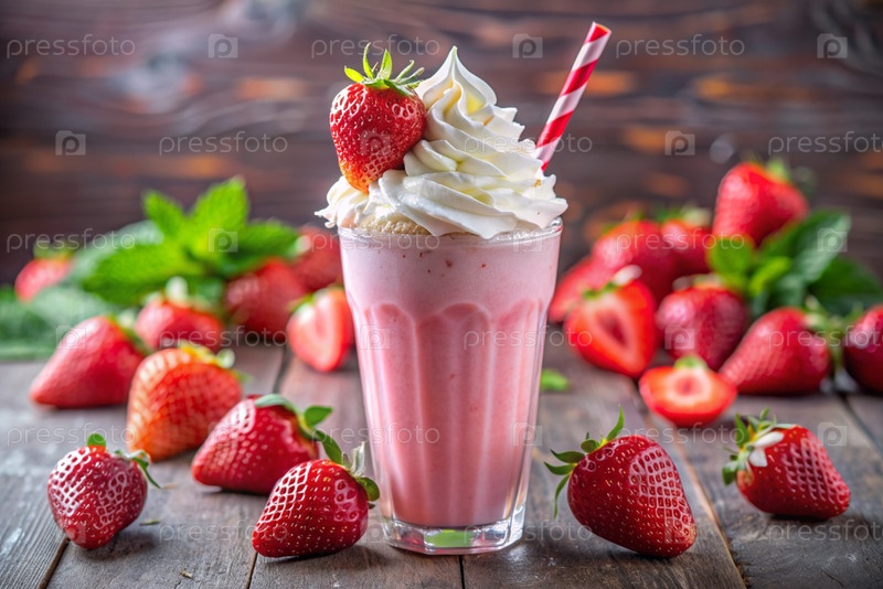 Освежающий клубниковый молочный коктейль с битой сливкой и соломой на столе, окруженном свежими ягодами