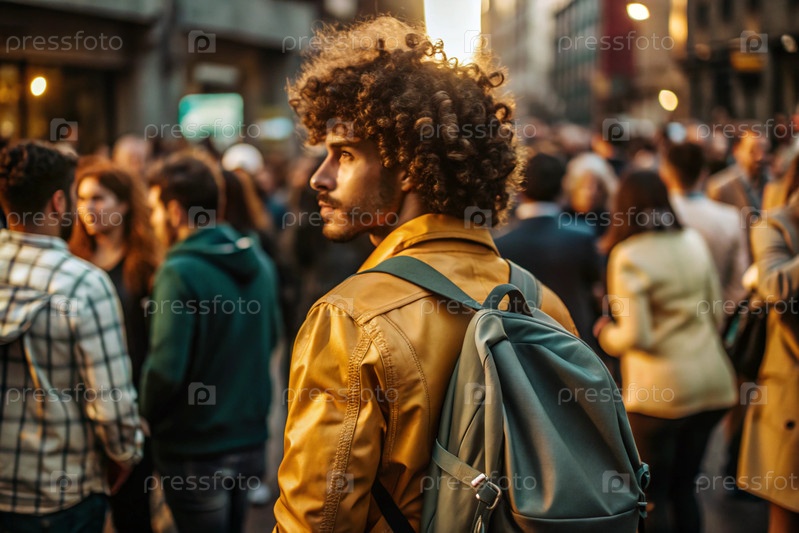Портрет поднимающегося путешественника-мулата в желтой куртке и с рюкзаком по городу.Путешествие в одиночку - это образ жизни.Молодой турист наслаждается осенними каникулами