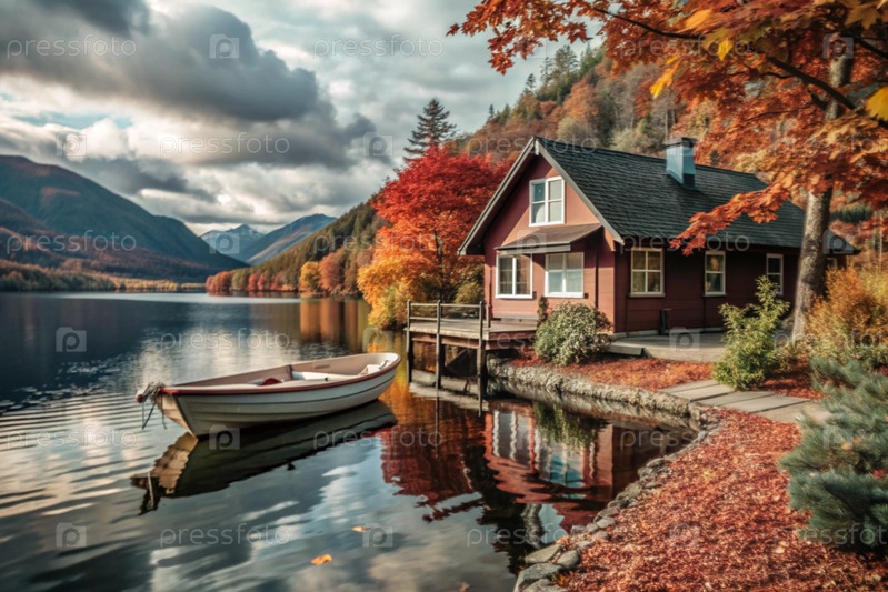 Осенний пейзаж. маленький уютный дом на озере и лодка на воде. деревья покрашены в яркие осенние цвета. атмосфера мира и гармонии с природой