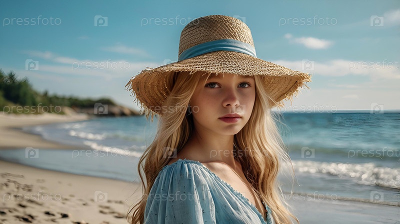 Летние каникулы на пляже, крупный план красивой женщины в соломенной шляпе.Лето. Праздники и праздники, место для копирования