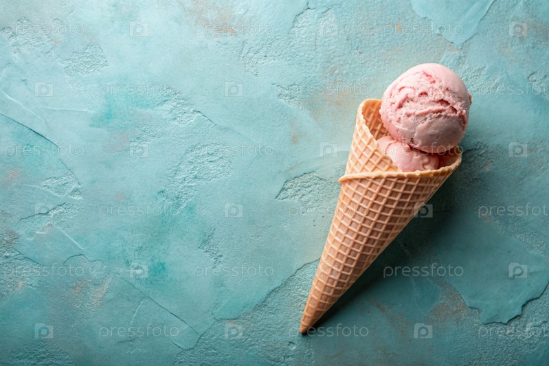 Сладкий десерт. Стильная современная концепция. Розовый мороженый конус на ярком бирюзовом фоне. Всемирный день мороженого
