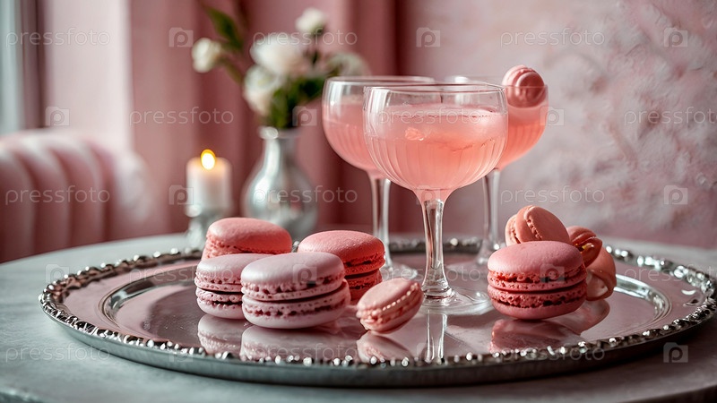 Элегантные мягкие розовые коктейли с льдом и морозом в винтажных бокалах на серебряном подносе с вишней и макаронами