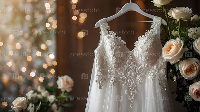 Близко. Элегантное белое свадебное платье на вешалке и букет цветов. Утро невесты. Аренда и покупка свадебных платьев для мероприятий