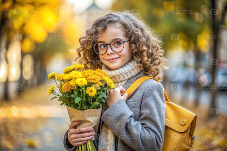 Красивая маленькая кудрявая девочка в очках и букете осенних цветов ходит в школу впервые. Ребенок со школьной сумкой, книгой и цветами. Малыш на городской улице. Возвращение к школе