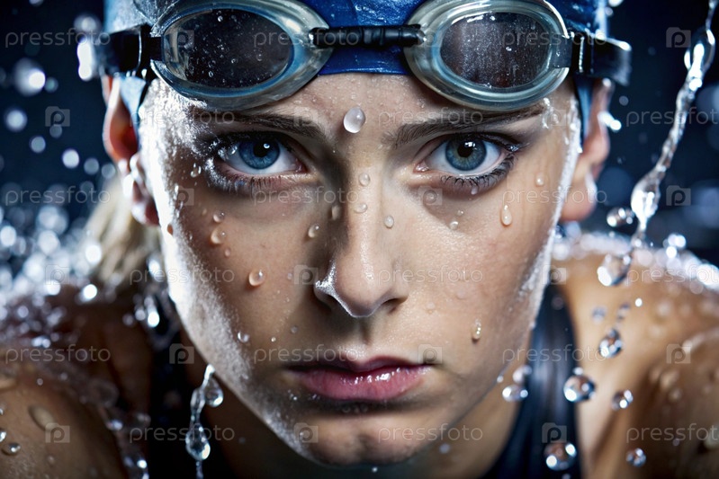 Спортивное плавание. Женское плавание. Спортсменка, которая носит очки для плавания в бассейне во время соревнований на близком расстоянии. Женщина смотрит прямо в камеру