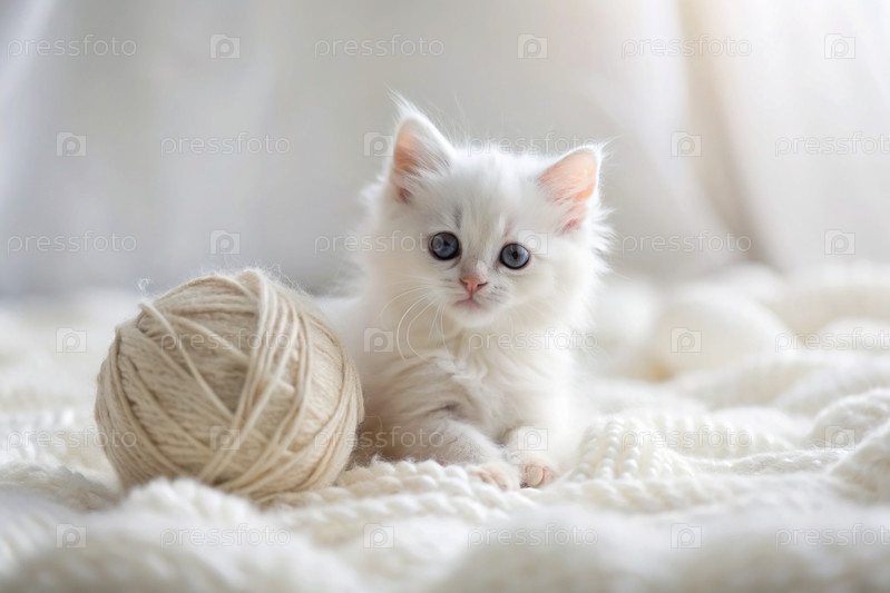 Животные. маленький пушистый белый котенок играет с шариком пряжи на белой кровати. любопытный кот лежит на белом одеяле и смотрит в камеру. текстиль, вязание