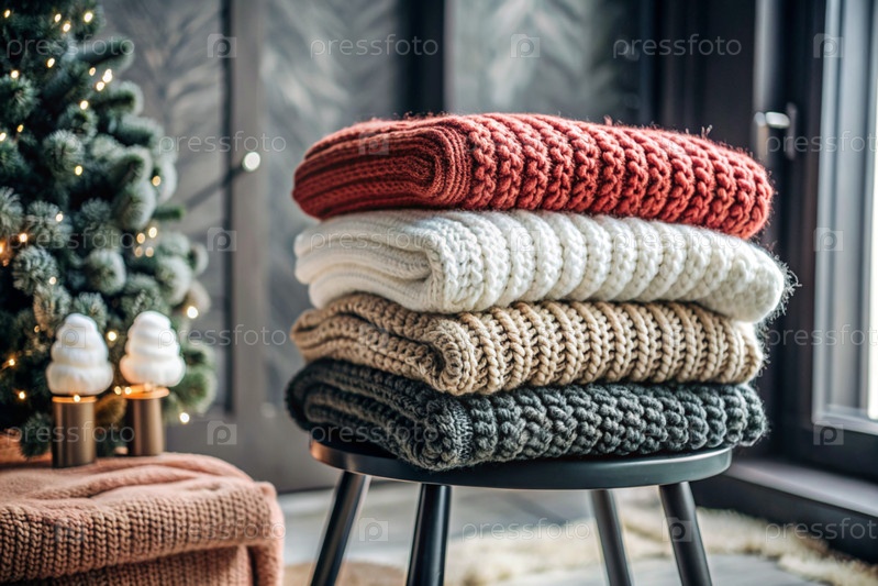 Близко, вяжу тёплую одежду на деревянном стуле в комнате.Зимний сезон, малый бизнес, ручная одежда