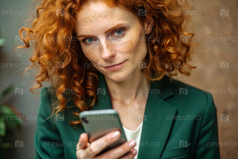 Деловая женщина с локонами красных волос и веснушками. Она одета в обычное зеленое пиджак. В руках смартфон. Небольшой бизнесмен смотрит на свой мобильный телефон