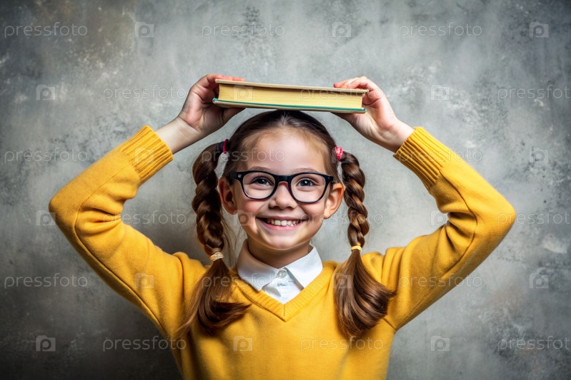 Красивая девочка с очками и книгами на голове.Ребенок впервые ходит в школу.Дети на свежем воздухе.Возвращение к школе