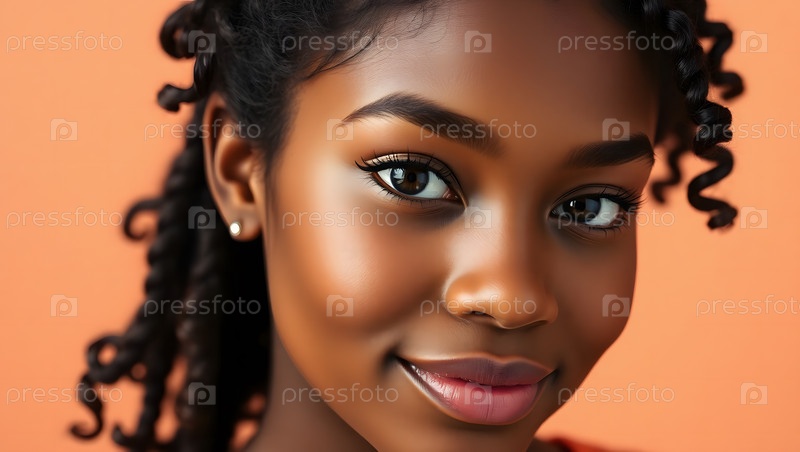 Красивый портрет черной девушки на нейтральном оранжевом фоне.Косметология, уход за кожей, лицо и макияж