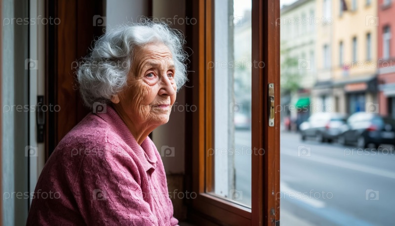 Одинокая грустная старушка смотрит в окно. дом престарелых, социальный приют. генерирование ИИ