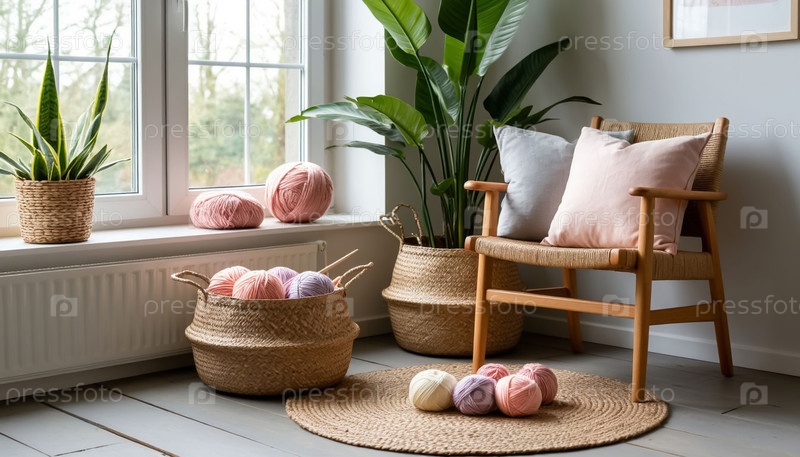 Уютный уголок ремесла в доме - стул и корзина с пряжей у окна