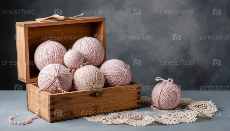 Пастельные вязаные шерстяные рождественские шары в стиле винтажного деревянного ящика. экологически чистые игрушки
