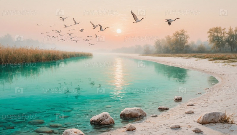 Краны летают через изумрудную реку на рассвете в тумане